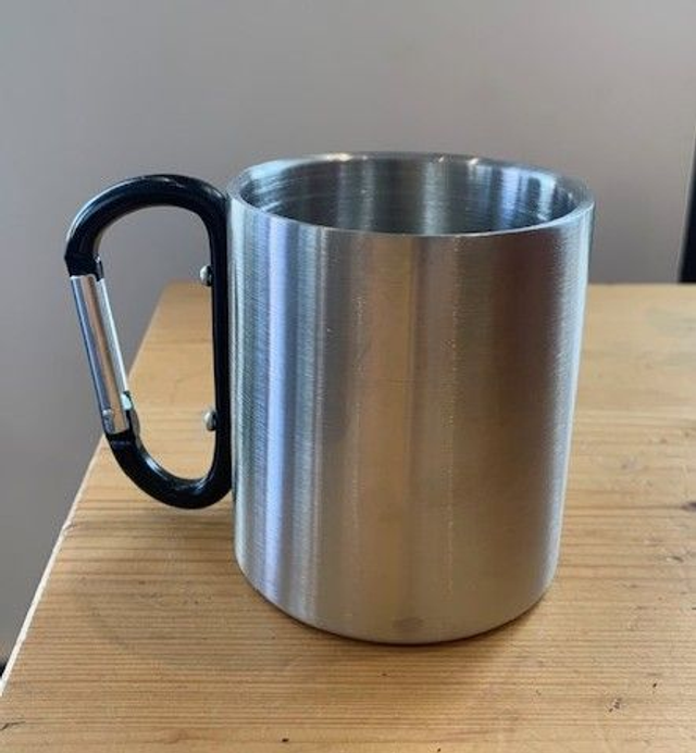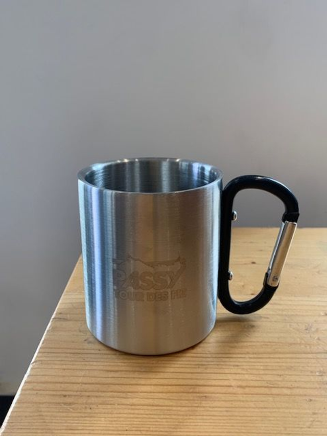 Mug mousqueton Tour des Fiz, en inox, idéal pour le bivouac et la rando, s’attache facilement au sac à dos.